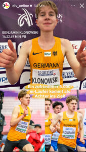 In der Meldeliste über 5.000 Meter war der Name von Benjamin Klonowski (TuS Lichterfelde) als viertletzter zu finden gewesen. Doch der Langstreckler, der am Montag, dem Anreisetag, seinen 18. Geburtstag gefeiert hat, verkaufte sich im Finale glänzend. In einem taktischen Rennen, in dem die Läufer bis zum letzten Kilometer im Pulk unterwegs waren, sortierte er sich selbstbewusst weit vorne ein und musste schließlich nur eine Handvoll Athleten ziehen lassen, die das Tempo noch einmal ordentlich verschärften. In 14:22,49 Minuten wurde er Achter, in seinem erst zweiten 5.000-Meter-Rennen wurde obendrein eine neue Bestzeit notiert.