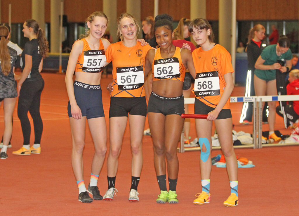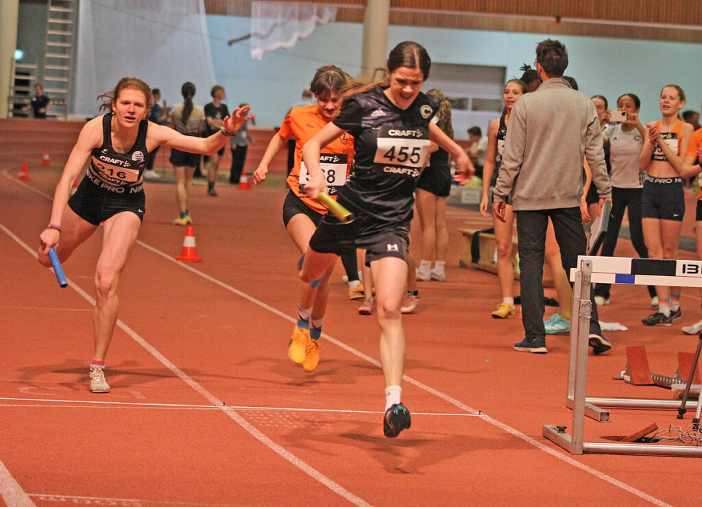 Ein kleiner Höhepunkt waren die 4 x 200 Meter Staffeln. Durch den verletzungsbedingten Ausfall von Naima Sakho musste Trainer Kalli die Staffel umstellen und so ging die Mannschaft in der Aufstellung: Ada Bjaon-Marie Merten-Kiana-Soo Kamya-Mette Mertsching in das Rennen. Ada lief das Rennen an und wechselte mit leichter Führung, bevor Marie den Staffelstab übernahm. Auch als Kiana-Soo ins Rennen ging sah es bisweilen aus, dass unsere TuS Li Staffel über sich hinauswachsen würde. Obwohl Mette Mertsching stark kämpfte, gab es ein Wimpernschlag Finale zwischen der Mannschaft vom SCC Berlin (1:54,10), BSV 1892 (1:54,56) und dem TuS Lichterfelde (1:54,66). Ganze 56 Hundertstel lagen zwischen Platz 1 und Platz 3.